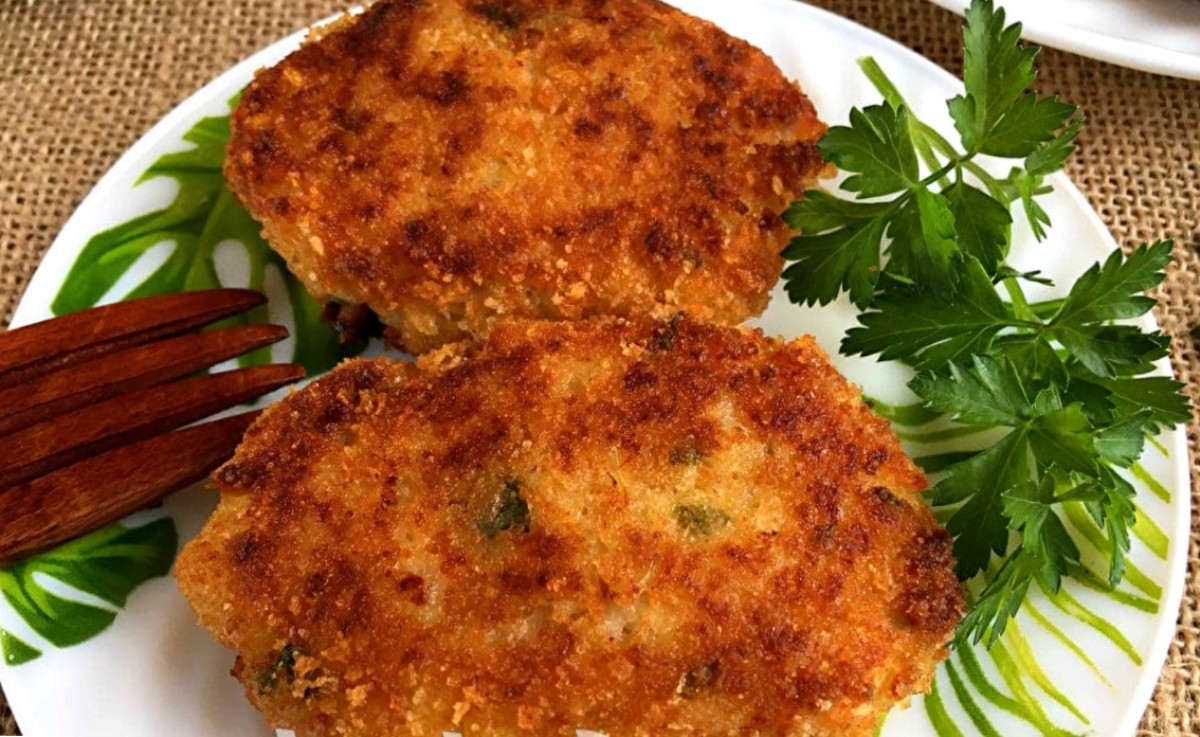 Formuokite kotletus, apvoliokite džiūvėsėliuose ir kepkite augaliniame aliejuje iš abiejų pusių.