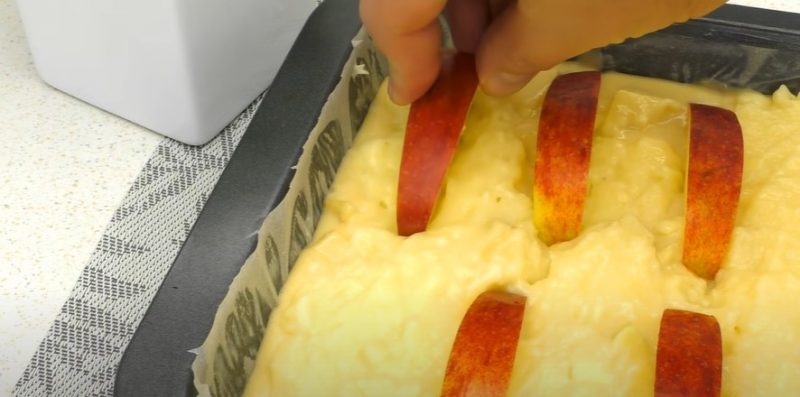 Mes uždedame obuolių gabalėlį ant viršaus grožiui ir siunčiame pyragą į orkaitę.