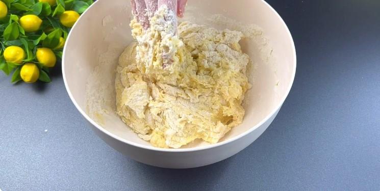 Į mišinį suberkite miltus ir užminkykite tešlą. Pirmiausia išmaišykite šluotele, o tada vėl suberkite miltus. Kai tešla pradeda formuotis gumulas, minkau ją rankomis. Dėl to ji turėtų būti tiršta, bet neužkimškite miltais.