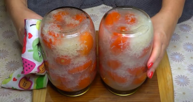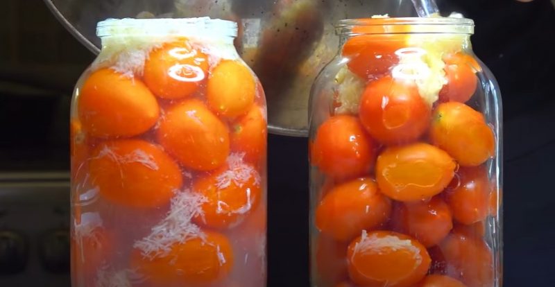 Mes uždedame česnaką, pomidorus ir užpilame verdantį vandenį, uždengiame dangteliais ir paliekame 20 minučių.