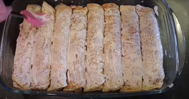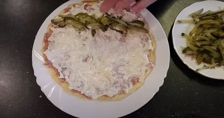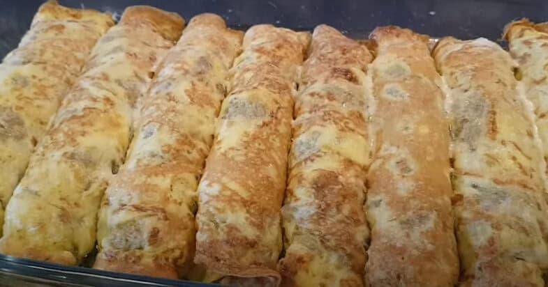 Įdarą tepu ant kiaušininių blynelių, užpilu padažu ir juostelėmis supjaustytais marinuotais agurkais, susuku.