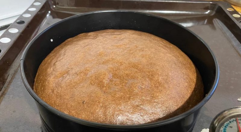 Kepimo forma yra padengta pergamentu, užpilama tešlos viduje.