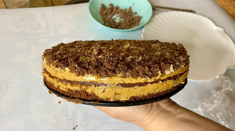 Supjaustytas sausainis supjaustomas į dvi apvalias dalis. Viršus iš vieno pyrago yra pašalinamas ir susmulkinamas į trupinius, kad būtų galima toliau apdailinti pyragą.