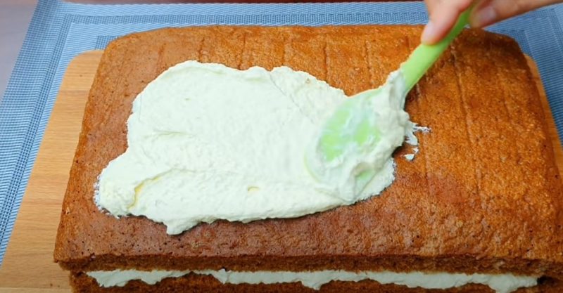Vieną pyragą sutepkite plokščiu grietinėlės mišinio sluoksniu. Kremą uždenkite antrąja sausainių dalimi. Mes uždengiame grietinėlės viršaus liekanas ir šonines torto puses.