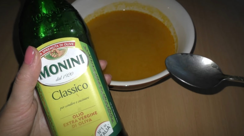 Supilkite gautą mišinį į platų indą ir įpilkite alyvuogių aliejaus.