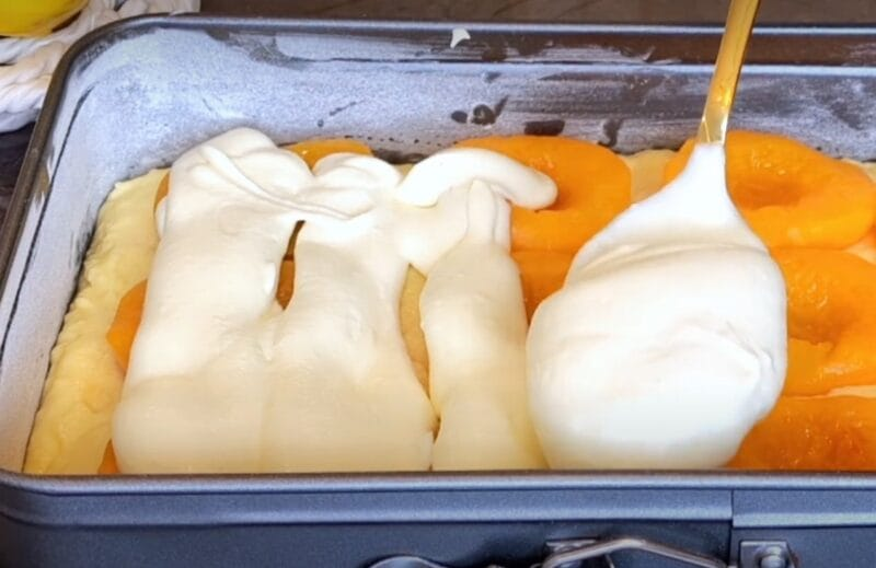 Norėdami paruošti kremą, sumaišykite varškę su kiaušiniu, vanile, cukrumi ir grietine. Varškės masę plakite mikseriu iki purios ir vienalytės masės. Persikų sluoksnį aptepkite kremu ir tolygiai paskirstykite.