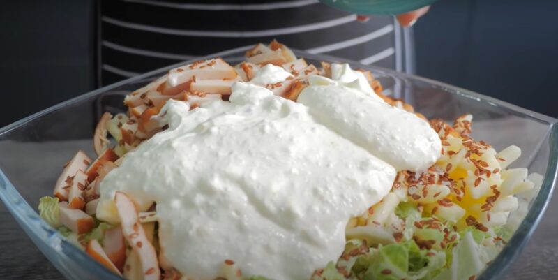 Sumaišykite žievelę su jogurtu ir druska, sumaišykite. Užpildykite salotas šia mase, kruopščiai sumaišykite komponentus.