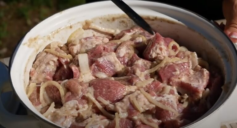 Uždenkite dangčiu ir padėkite į šaldytuvą marinuotis. Kai viskas bus paruošta, suverkite ant iešmelių ir išimkite svogūną, kad nesudegtų.