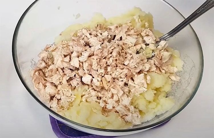 3. Giliame dubenyje sumaišykite susmulkintą vištienos krūtinėlę ir atvėsusią bulvių košę. Įberkite druskos ir pipirų pagal skonį. Gerai išmaišykite mišinį, kad ingredientai pasiskirstytų tolygiai.