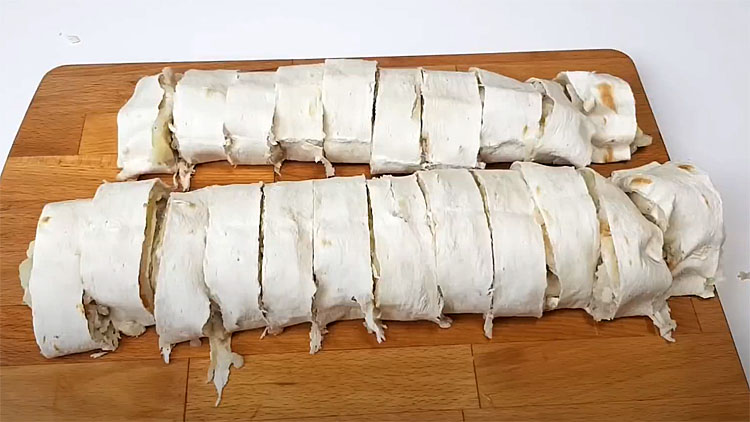 5. Pradėkite atsargiai vynioti lavašą nuo vieno galo, palaipsniui formuodami tvirtą ritinį. Stenkitės jį suvynioti kuo tvirčiau, kad kepant jis nesuirtų. Supjaustykite ritinį maždaug 3–4 cm pločio gabalėliais.