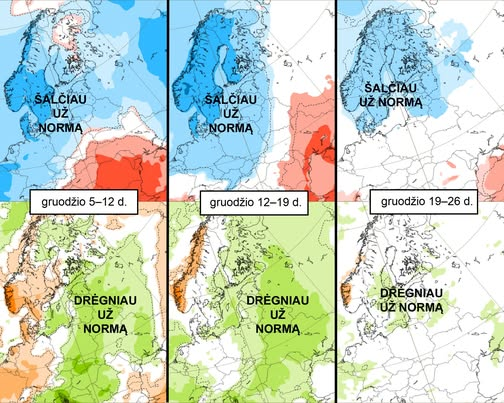 Panašius skaičiavimų rezultatus pateikia ir CFSv2 ilgalaikių prognozių modelis: gruodis turėtų būti maždaug 1–1,5 laipsnio šaltesnis nei daugiametis vidurkis, o kritulių kiekis iki 20–25 proc. didesnis už vidurkį“, – skelbė sinoptikai.