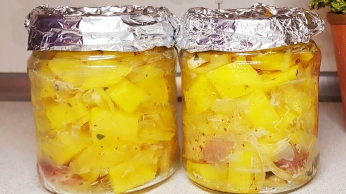 Svogūnus supjaustykite plonais pusžiedžiais ir marinuokite marinate (sumaišykite visus ingredientus).