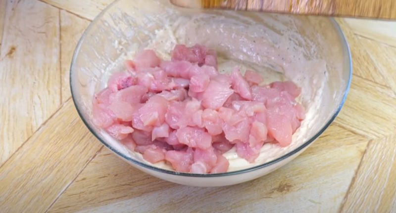 Mėsą supjaustykite mažais gabalėliais ir sumaišykite su kiaušiniais, majonezu, druska, prieskoniais ir pipirais.