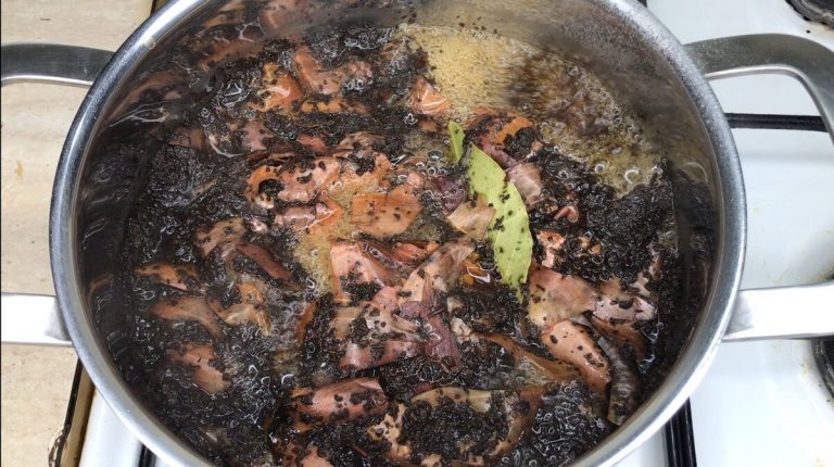 Pastatykite puodą ant ugnies ir palaukite, kol užvirs. Virkite 5 minutes. Marinatą atvėsinkite ir perkoškite. Gausite sodrios rudos spalvos skystį.