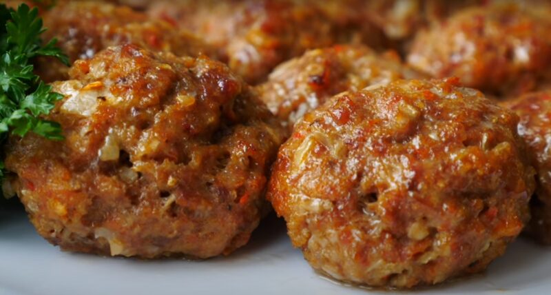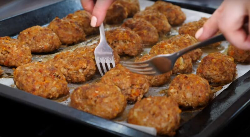 Mes uždengiame keptuvę pergamentu, ant jo išdėstome suformuotus mažus kotletus. Kepkite orkaitėje 200 laipsnių temperatūroje apie 35-40 minučių.