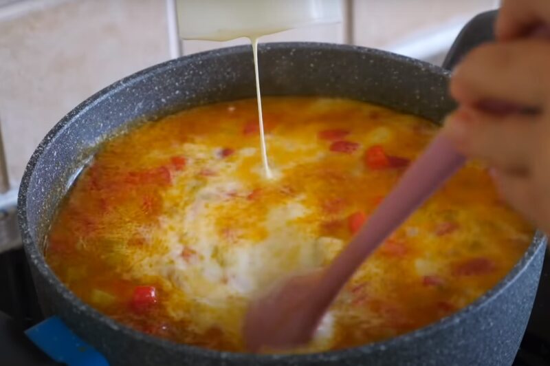 Likus minutei iki makaronų išvirimo, supilkite grietinėlę, išmaišykite ir toliau virkite sriubą.