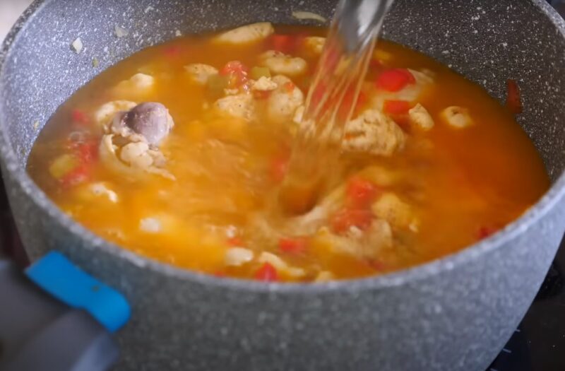 Puode ant didelės ugnies kepkite mėsą ir sparnelius, kol jie pakeis spalvą. Smulkiai supjaustykite papriką, raudonąją papriką, svogūną ir pomidorą.