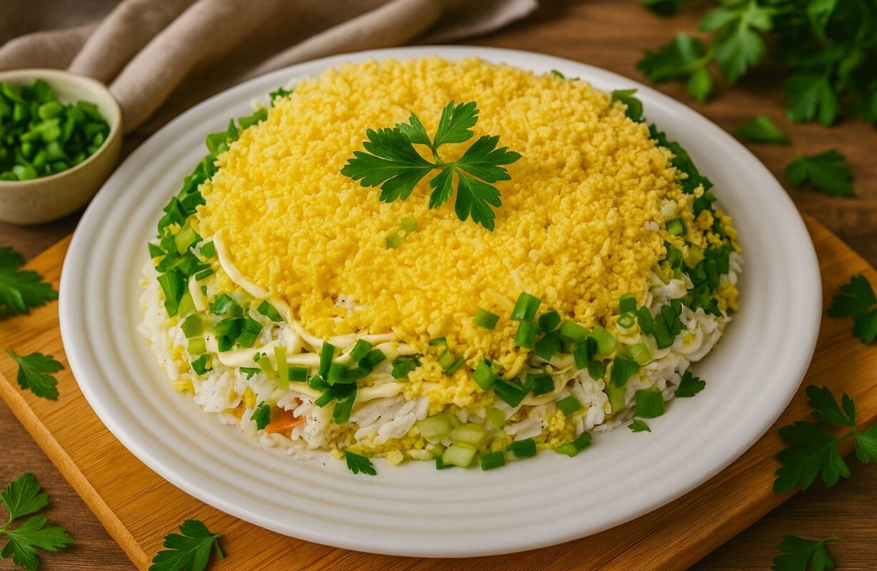 . Baltymų sluoksnį patepkite majonezu, trynius ant jo užtarkuokite smulkia tarka.