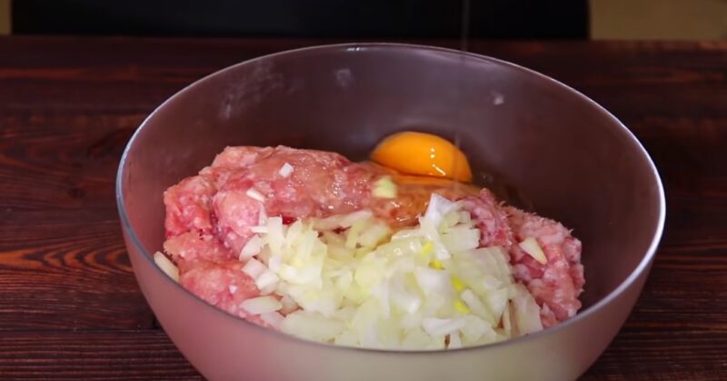 Supjaustykite mažus svogūnų kubelius, įpilkite į smulkintą mėsą. Kiaušinį sudažykite į mėsos masę, supilkite druską ir juoduosius maltus pipirus, gerai išmaišykite.