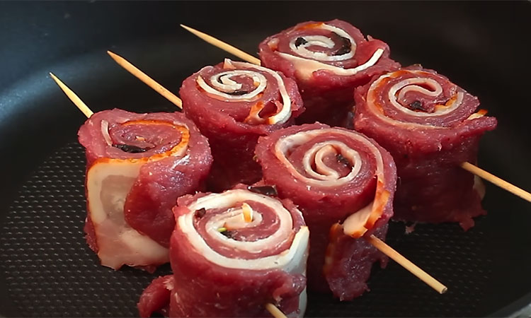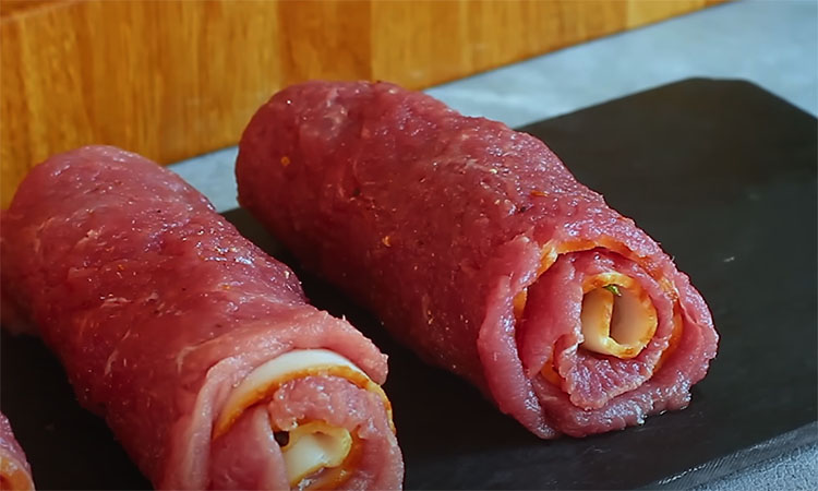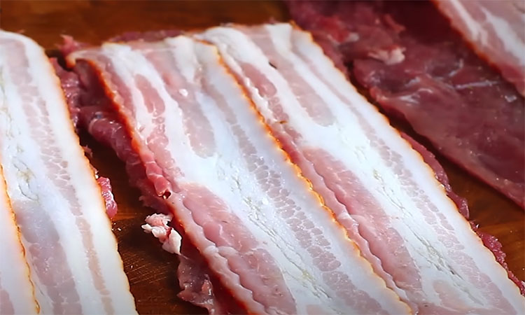 Ant kiekvieno gabalėlio uždėkite šoninės, smulkiai supjaustyto rozmarino ir smulkiai supjaustytų džiovintų slyvų. Sandariai suvyniokite mėsą, sutvirtinkite mediniais iešmeliais ir nukirpkite visus perteklinius galus.
