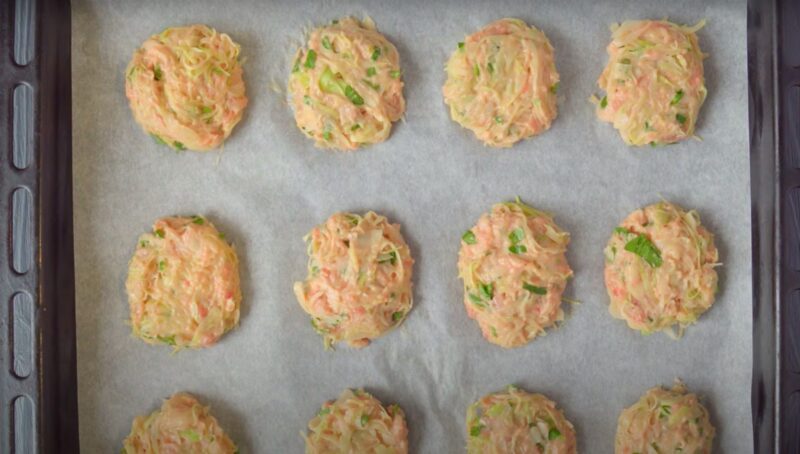 Suformuotos koteliai yra išdėstyti ant padėklo, padengto pergamentu. Kepkite kotletus orkaitėje 200 laipsnių kampu pusvalandį.