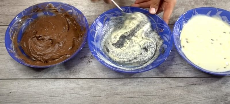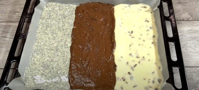 Vieną dalį sumaišykite su kakava, antrąją su aguonomis, trečią su razinomis.