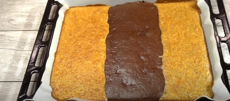 Uždenkite kepimo skardą pergamentu. Į vidurį pilame kakavinę tešlą, šonus beriame aguonas ir razinas.