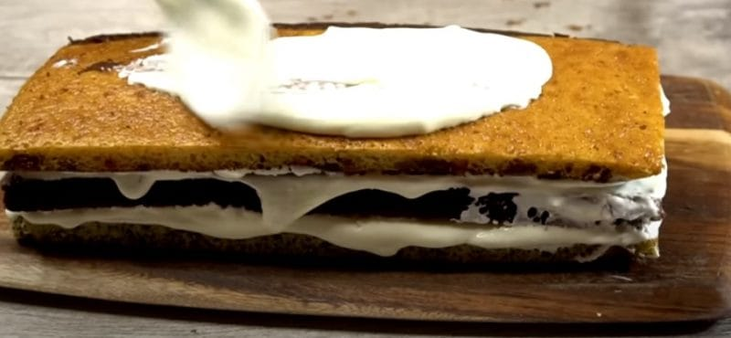 Formuojame tortą, pyragėlius patepame kremu, aptepame viršų ir šonus, pabarstome trupiniais iš likučių.
