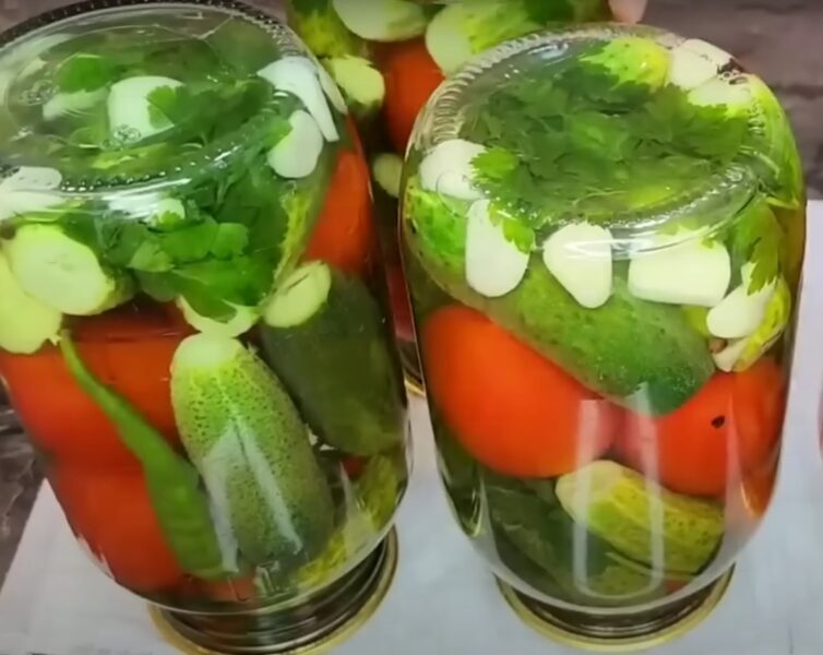 Virkite sūrymą 3 minutes, užvirinkite ir įpilkite acto. Supilkite verdantį sūrymą į stiklainius su agurkais ir pomidorais ir užsukite dangteliais.