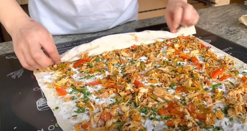 Skrudintos daržovės ir mėsa tolygiai pasiskirsto visame lavašo paviršiuje. Tada sluoksnis su įdaru turi būti pasuktas į ritinį.