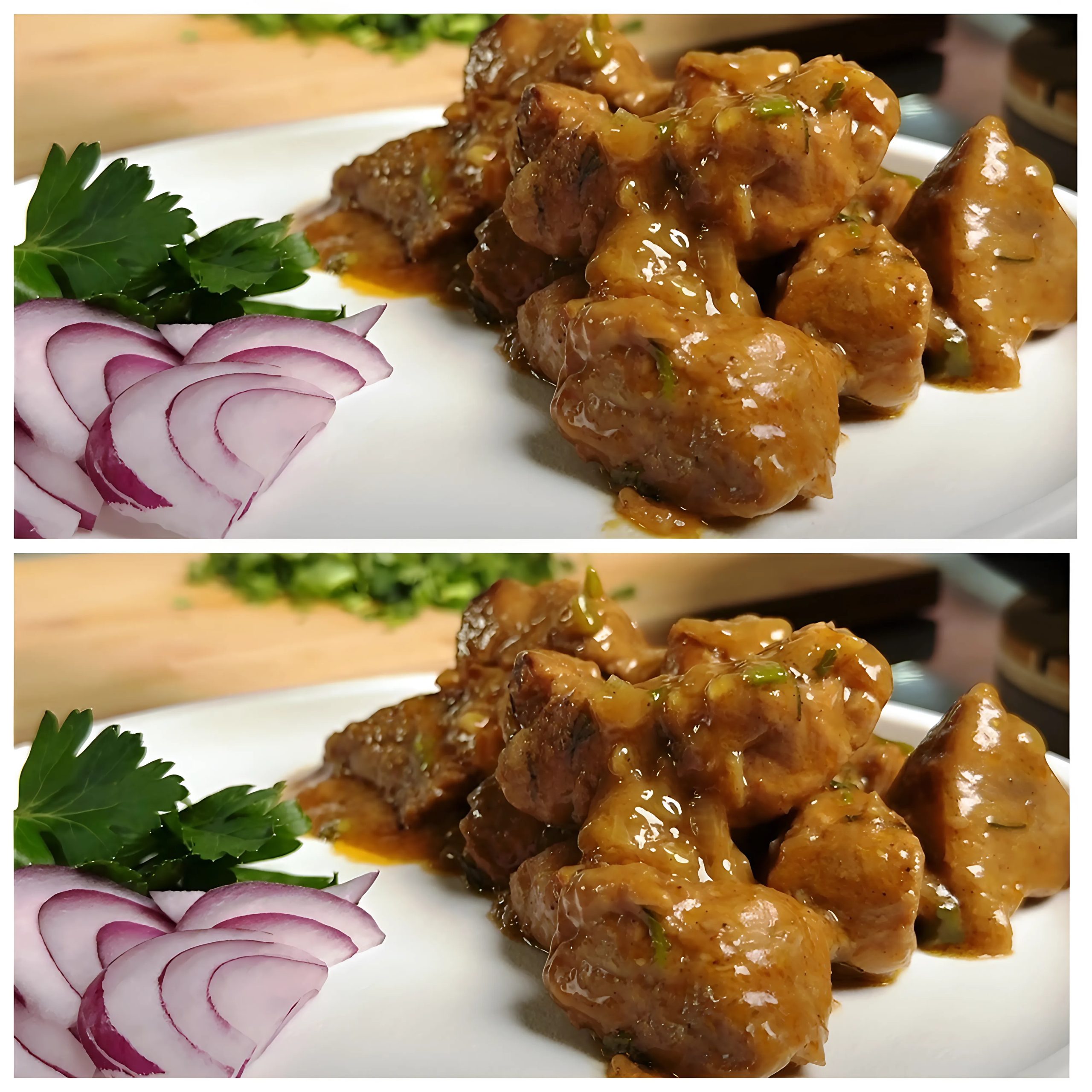 Supilkite sojų padažą ir išmaišykite. Įpilkite garstyčių, uždenkite dangčiu, įkaitinkite iki minimalios ugnies. Tegul troškinasi pusvalandį. Tuo tarpu susmulkinkite žoleles ir vandenyje ištirpinkite krakmolą. Supilkite skystį į mėsą ir pabarstykite žolelėmis. Vėl uždenkite ir palikite 7 minutes. Mėsa paruošta. Ji labai minkšta, malonaus aštraus aromato ir skonio. Ją galima derinti su bet kokiu garnyru.