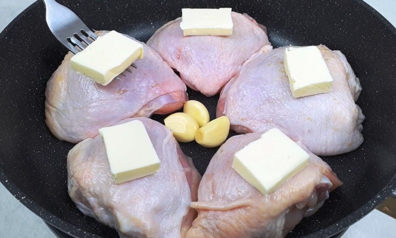 Ant kiekvienos šlaunelės uždėkite po gabalėlį sviesto ir apverskite į kitą pusę, kepkite toliau.