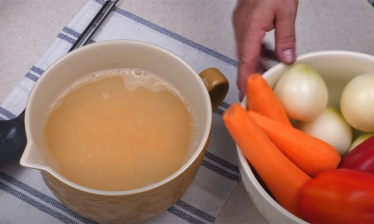 Užpilkite žirnelius verdančiu vandeniu ir palikite valandai, kad išbrinktų ir suminkštėtų. Tada nuplaukite, sudėkite į puodą ir įpilkite verdančio vandens, kol apsems žirnelius. Virkite ant silpnos ugnies, reguliariai maišydami, kol žirneliai suminkštės. Jei vanduo išgaruos, įpilkite daugiau. Tuo tarpu paruoškite daržoves.