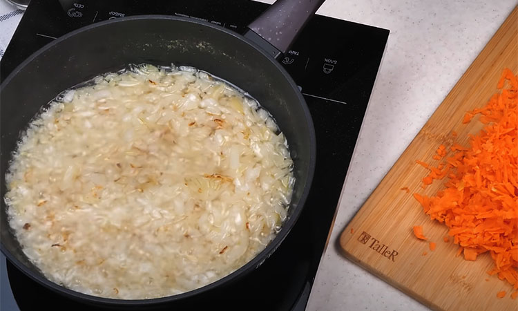 Svogūną supjaustykite kubeliais, o morką – stambiai arba smulkiai. Kepkite svogūną augaliniame aliejuje iki auksinės rudos spalvos, tada sudėkite morkas ir toliau kepkite. Kai svogūnas ir morkos gražiai apskrus, sudėkite smulkintą papriką ir kepkite dar 5–7 minutes. Paruoštą daržovių mišinį sumaišykite su virtais žirneliais.